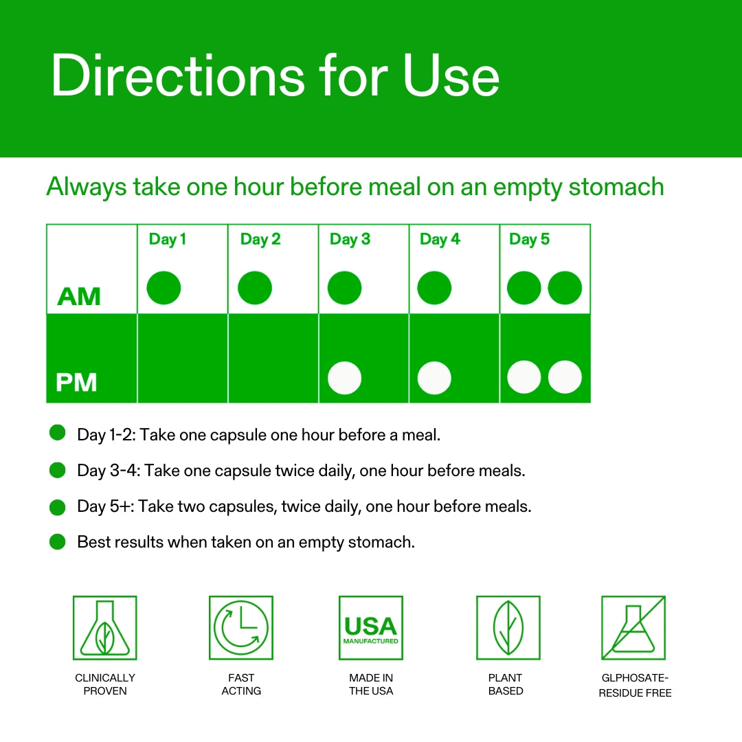 Start with one capsule daily before a meal. Over five days, build up to two capsules twice daily before meals. This helps your body adjust. When stopping, follow the same five-day process to ease back.