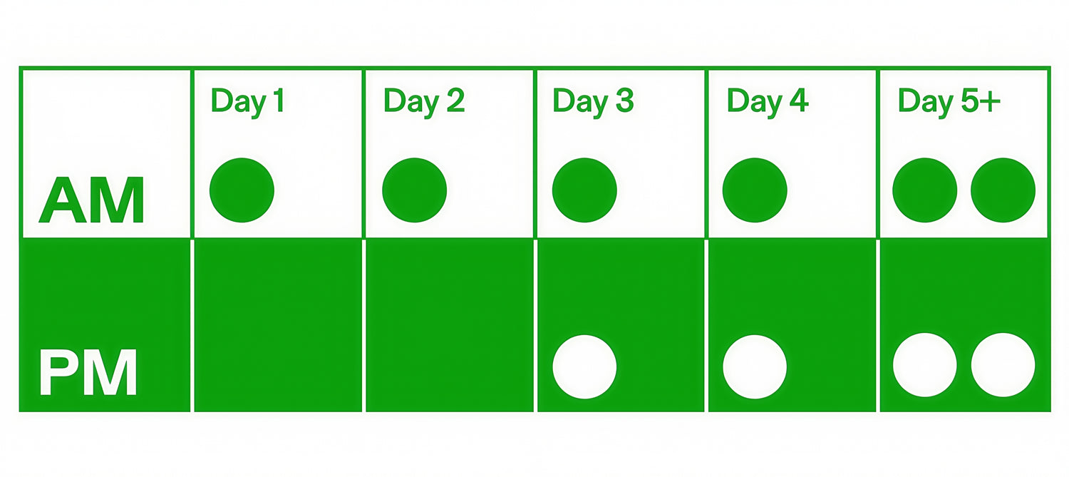Day 5+: Take two capsules twice daily, one hour before meals.